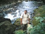 mac is watching me take the pic as I precariously am on the side of a huge slopping rock. sauvy is next to him and his dog is right by his hand behind.