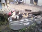 Augie my pet farm pig has decided he has to get in my lap....He leans on me, slides down and pins me by my feet! geez