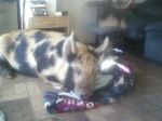 then i saw the grate was not over the heater vent..omgawd Harrybuns went down there! Then the dogs took off down the hall...Harry musta heard me and came out, got him from under the bed...whew. Well back door Augie pushed open was open. where is augs??? I go down the hall to get into bed. ALL my bedding, a huge feather/down bed, sheets down comforters, down pillows, AND part of my curtain a fifty dollar hanging....and Augie asleep on top with the sheer shiney sparkly sash over his nose....lol Nothing rooted up either. wish I had a picture. i was too s ick.