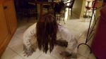 Supposed to be that freaky girl from the well in the movie "The Ring."